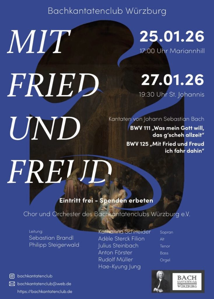 „Ein besonderer Konzertabend fand in der vollbesetzten Augustinerkirche in Würzburg statt, als der Bachkantatenclub e.V. unter der Leitung von Sebastian Brandl und Philipp Steigerwald zwei Kantaten von Johann Sebastian Bach aufführte. Das Konzert stand unter dem Titel „Die Liebe soll nichts scheiden“ und bot einen eindrucksvollen musikalischen Bogen über das Thema der Liebe in der Barockmusik. Der Abend begann mit einer feierlichen Darbietung des Chores, der den alttestamentarischen Text „Sicut lilium“ von Antoine Brumel aus dem „Hohelied Salomons“ sang. Der Chor schuf einen kraftvollen, homogenen Klangteppich und stimmte das Publikum auf das Thema der Liebe ein. Später im Konzert sang der Chor denselben Text auch noch in einer modernen Version (2006) von Marek Raczynski – eine gelungene Brücke! Ein weiteres Highlight war die Orgelimprovisation von Hans-Bernhard Ruß, die nahtlos zur anschließenden Kantate überleitete: Philipp Steigerwald dirigierte BWV 77 „Du sollt Gott, deinen Herren, lieben“ sehr differenziert und zeigte damit die tiefe, spirituelle Hingabe dieser Musik. Verhalten-innig trug die junge Sopranistin Sydney Penny die Arie „Mein Gott, ich liebe dich“ vor, während das Tenor-Rezitativ von Stefan Schneider das Publikum mit der Zeile „Gib mir dabei, mein Gott! Ein Samariterherz“ rührte. Lieselotte Fink, begleitet von Trompete und Continuo, stellte eindrucksvoll die Unvollkommenheit der menschlichen Liebe dar. Neben weiteren Orgel- und Orchesterbeiträgen war der Höhepunkt des Abends Bachs Kantate BWV 140 „Wachet auf, ruft uns die Stimme“, die unter der Leitung von Sebastian Brandl zu einem ergreifenden Erlebnis wurde. Der Eingangschor, die virtuosen Duette und der feierliche Schlusschoral zeigten die gesamte Bandbreite von Bachs musikalischem Geniezug. Die Aufführung des Bachkantatenclubs war ein künstlerisches Meisterwerk. Die präzise und gefühlvolle Ausführung der Solisten und des Chores unterstrich die Zeitlosigkeit von Bachs Musik und ließ die Thematik der Liebe tiefgründig und ergreifend erlebbar werden. Das Konzert erntete begeisterten Beifall und zeigte einmal mehr, welche große kulturelle Bereicherung der Bachkantatenclub für Würzburg darstellt.“